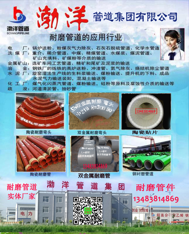滄州渤洋管道集團(tuán)有限公司是華北專業(yè)生產(chǎn)耐磨管道,耐磨材料的集團(tuán)化產(chǎn)業(yè)公司。公司下屬鑄造分公司、陶瓷科技分公司、(2013年外貿(mào)公共技術(shù)服務(wù)平臺(tái))、砼泵配件分公司、傳媒分公司、國(guó)家電力耐磨管道研究所、耐磨材料檢測(cè)中心。 鑄造分公司年產(chǎn)能6000噸合金管道,陶瓷科技分公司年產(chǎn)能8000噸陶瓷復(fù)合鋼管,實(shí)現(xiàn)年產(chǎn)值3億元。 公司主要產(chǎn)品為國(guó)家“863計(jì)劃”高科技新型材料SHS陶瓷內(nèi)襯復(fù)合鋼管、高耐磨雙金屬管、稀土合金管、堆焊合金、碳化硅、龜甲網(wǎng)、硬質(zhì)陶瓷貼片、陶瓷鎧裝、襯塑等管道及管件;耐磨鋼球及耐磨襯板。公司產(chǎn)品廣泛用于電力送粉、輸灰、脫硫、煙道;礦山尾礦輸送、洗選系統(tǒng);洗煤系統(tǒng);冶金高爐送粉、除塵、沖渣、煙道、除灰系統(tǒng);船舶疏浚、抽沙系統(tǒng);水泥廠輸灰、窯爐窯口、料倉(cāng)、溜槽系統(tǒng);石油、化工、冶金、船舶、造紙、電力、航天、水處理、化纖、城建及機(jī)械設(shè)備等行業(yè)。