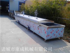 鳳爪殺菌機 熟食包裝袋殺菌機 巴氏滅菌機采用食品級材料安全可靠、無污染。輸送平穩,速度可調,物料隨輸送帶的行進運動,能夠避免對輸送物的損壞。噪音較小,適合于工作環境要求比較安靜的場合。結構簡單,便于維護。能耗較小,使用成本低。設備配備上漂壓網帶,可以防止產品在水中因浮力作用產生上浮滯留現象。本機以熱水為介質,整體采用不銹鋼制作,可根據包裝物的要求對溫度和時間進行任意調整。該機結構緊湊、操作方便、故障率低,特別適合連續蒸煮、殺菌作業。水浴式漂燙功能可有效的將物料均衡的混合在介質水中,提供了對物品的預煮效果,可調速式輸送系統可有效的控制產品的漂燙時間,合格的完成產品的漂燙工藝。整機采用不銹鋼制造(電器元件除外),清洗方便,滿足國家對食品衛生的相關規定;為保證溫度誤差小,采用溫度傳感器,并在進口和出口各安裝一只;采用變頻器,調節傳送帶步進速度,精確度高;槽體采用2mm不銹鋼制作;受力處采用4mm不銹鋼制作;架體采用50×50×3不銹鋼方管制作;保溫外包采用1mm不銹鋼;上蓋采用1.2mm不銹鋼;整機軸承和軸承座全部采用不銹鋼制作;循環水泵前邊加有過濾系統(采用三角網孔過濾),以防止槽內雜質抽到泵中和長時間在殺菌(冷卻)槽內循環;過濾器清理口采用無工具拆裝,讓清理雜質簡單方便。在過濾器前邊和循環泵的后邊分別裝有閥門,以方便在過濾器清洗和循環泵的檢修過程中不至于把整槽水放掉以減少對資源的浪費。