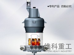 主電機動力經齒輪減速機減速后,驅動中心軸及固定在中心軸上的磨輥總成吊架旋轉,磨輥總成在離心力的作用下繞立軸水平擺動,使得磨輥平行向外壓緊磨環。鏟刀鏟起的物料在磨輥與磨環之間的工作面進行研磨。研磨后的細粉被鼓風機的氣流帶入主機上部的分析機分選,達不到粒度的粉料落入主機腔內重新研磨,粒度分級合格的成品隨氣流進入旋風集粉器收集。