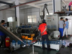 工藝流程:將各種原料計量→投料→高速混合→低速混合→轉料(通過管道或人工方式)→將干混料投入擠出機料斗→物料在擠出機中經過擠壓塑化→而后多孔模將塑化的熔體擠出成條→經過水槽冷卻→切粒。